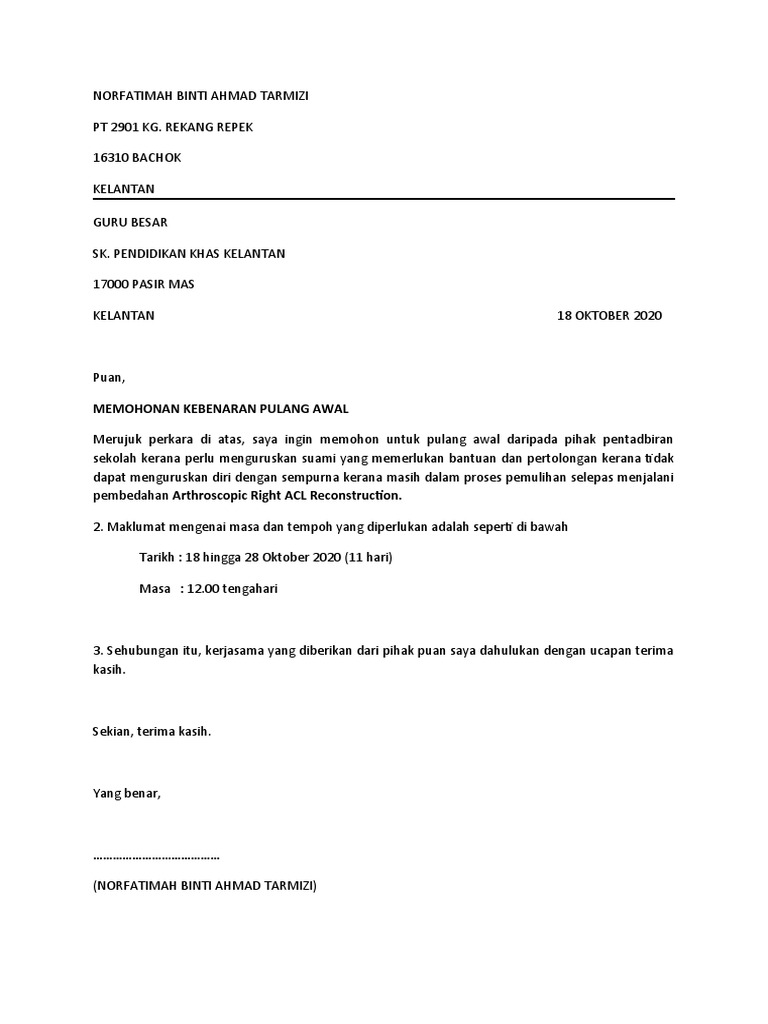Permohonan khas untuk pulang awal ke kampung dengan segala hormatnya perkara di atas dirujuk. 0 penilaian 0 menganggap dokumen ini bermanfaat 0 suara 14K tayangan 1 halaman. Permulaan yang baik untuk menulis surat kebenaran hendaklah bermula dengan perkataan.